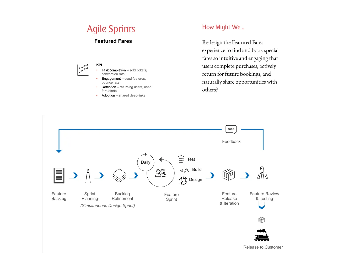 The revamped featured fares experience delivered measurable results. We achieved a 14% increase in traffic to fare pages and a notable uplift in booking conversions within three months of launch. We also reduced the design-to-development handoff time from two weeks to three days with the new component-based workflow.