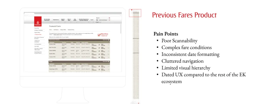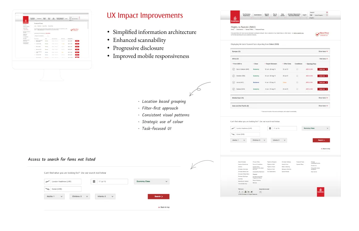 Emirates' method for showing promotional fares was outdated and fragmented across web, mobile, and email. This resulted in slow, multi-week rollouts and a frustrating experience for customers trying to find the best deals. The challenge was to design a unified, responsive experience that would increase conversions while transitioning the team to a more nimble way of working.